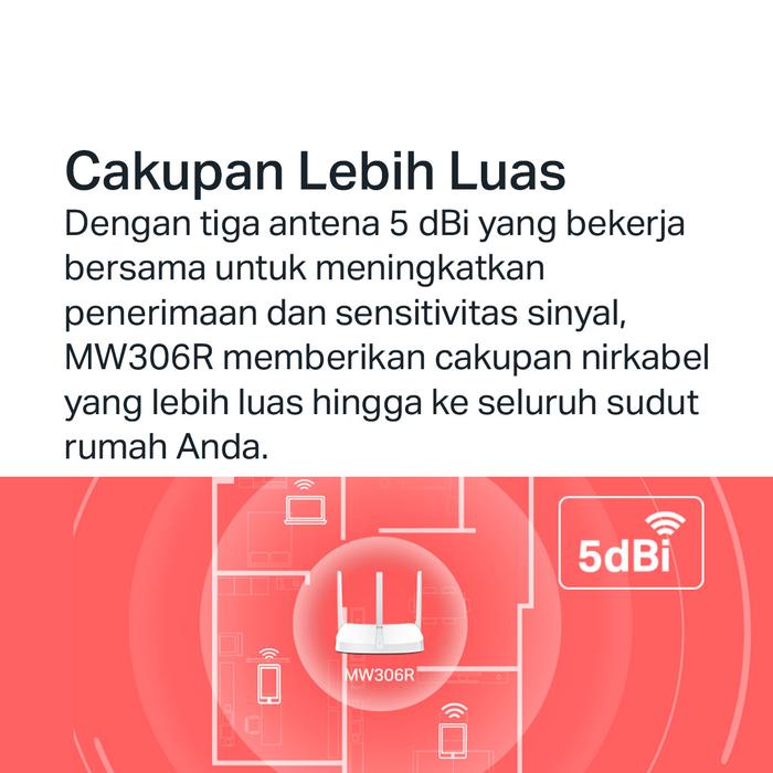 -Wi-Fi Stabil untuk Penggunaan Sehari-hari MW306R menyediakan koneksi yang cepat dan stabil untuk memenuhi semua kebutuhan jaringan Anda dengan kecepatan hingga 300 Mbps-Cakupan Lebih Luas Dilengkapi dengan tiga antena eksternal gain tinggi untuk mengirimkan sinyal Wi-Fi yang kuat ke setiap sudut rumah Anda-Multi-Mode Empat mode dalam satu perangkat untuk memenuhi semua skenario aplikasi-Instalasi mudah Halaman web intuitif memandu Anda melalui proses penyiapan dalam hitungan menit-Kontrol Orang Tua Aktif Tetapkan kebijakan akses yang sesuai untuk melindungi anak-anak dengan akses internet yang bertanggung jawab dan aman-Didukung IPTV dan IPv6