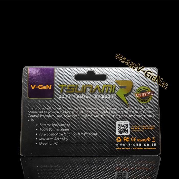 DDR4 GAMING Tsunami – (1x4GB) 4GB SINGLE CHANNEL – 3200 MHz – CL 16-18-18-36 – Chipset Micron / Samsung / Hynix (Tidak bisa request) – Ultra Low Voltage 1.35V – XMP 2.0 Support – Capable of operating above the XMP rated speed – Aluminum Alloy Heat Spreader with 1mm thickness, low heat operation – QC Pass for 72 Hours Burning Test – Lifetime Warranty (Rusak langsung tukar barang, tidak diservice)