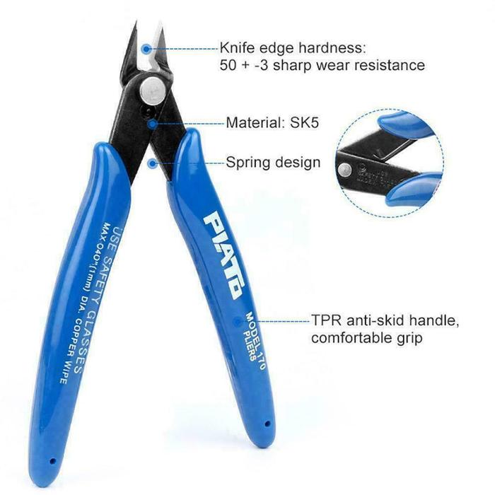 Tang potong ini memiliki pegas yang sangat ringan sehingga tidak membuat tangan lelah ketika menggunakannya. Dengan mata potong yang sangat tajam dan juga kecil sehingga memudahkan untuk pekerjaan pemotongan kabel atau element elektronik secara mudah.