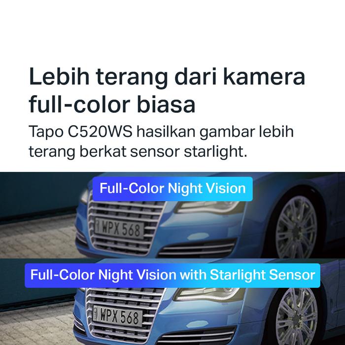 Starlight Color Night Vision-Adopting an F1.6 large-aperture lens and starlight sensor, Tapo C520WS captures more light and has higher photosensitivity, thus rendering brighter colors under lower light conditions than full-color night vision cameras with an F2.2 lens and ordinary sensor.