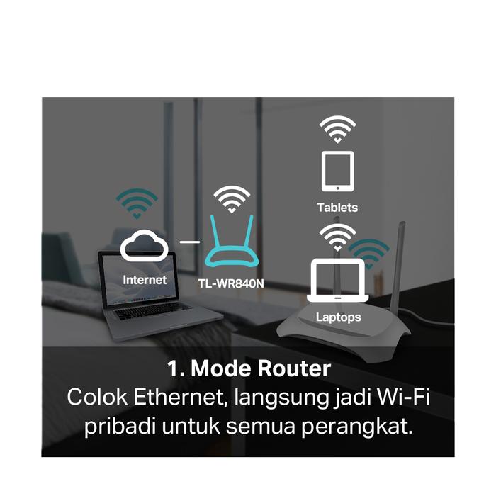 Fungsi Produk :TL-WR840N adalah gabungan kabel / jaringan nirkabel yang dirancang khusus untuk kebutuhan jaringan kecil rumahan. TL-WR840N menciptakan kinerja nirkabel yang luar biasa dan canggih, sehingga ideal untuk streaming video HD, VoIP dan game online. Dan juga, Tombol setup (WPS) Wi-Fi Protected pada bagian luar ramping dan modis memastikan enkripsi WPA2, mencegah jaringan dari intrusi luar.