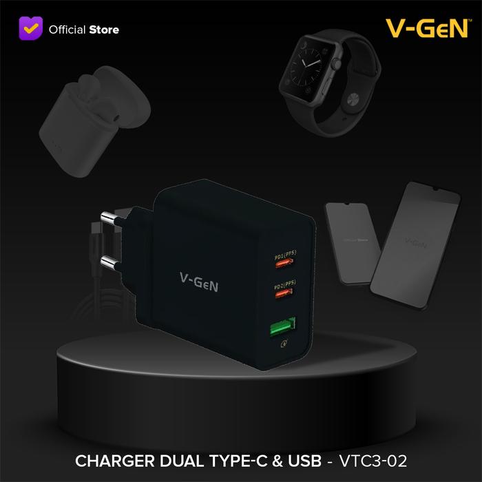 ADAPTOR CHARGER V-GEN VTC3-02 FAST CHARGING 2 PD QC4.0 TYPE C GAN 65W – Automatic Input Voltage : AC100-240V 50-60Hz 1.5A – PD1/2 Output : DC(PDO) 65W: 5V/9V/12V/15V/3A or 20V/3.25A (PPS): 3.3-21V/3A – USB A Output: DC 5V/3A or 9V/3A or 12V/3A or 20V/3A – PD1+USB A Output: PD1 45W: 5V/9V/12V/15V/3A or 20V/2.25A (PPS): 3.3-15V/3A USB A 18W QC: 5V/3A or 9V/2A or 12V/1.5A -PD1+PD2 Output: PD1 45W: 5V/9V/12V/15V/3A or 20V/2.25A (PPS) 3.3-15V/3A PD2 18W: 5V/3A or 9V/2A or 12V/1.5A -PD2+USB A Output: 5V/3A 15W – Auto ID : Maximum compability with smart detection techonology to negotiate the fastest charging supported by your device. – Built-inSafety Proctection for Over Current, Over Voltage, Over Heat and Short Circuit. – High grade fire retardant material with precision manufacturing – 1 Year Warranty