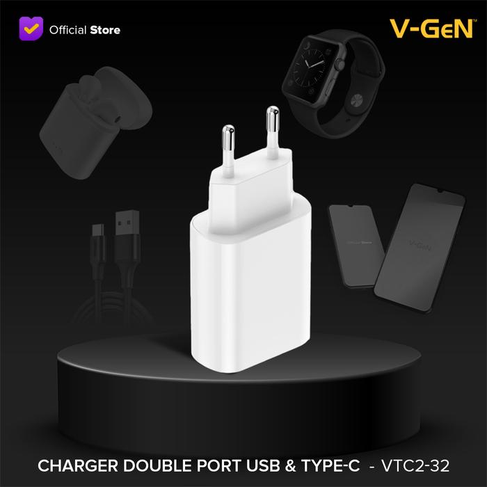 VTC2-32 DUAL PORT TYPE-C PORT UBS TYPE-A PORT Features : Automatic Input Voltage : 110-240V-50/60Hz 0.8A Max. Type-C Output : 5V/3A Max, 9V/3A, 12V/2.5A, 15V/2A , 20V/1.5A PD3.0 (30W Max) PPS:3.3-11V/3A., PPS: 3.3V-20V/1.5A USB A Output: 5V/3A Max, 9V/2A, 12/1.5A QC3.0 (18W Max). Total Output : 5V/3A (15 Max). Auto ID : Maximum compability with smart detection technology to negotiate the fastest charging supported by your device. Build-in Safety Protection for Over Current, Over Voltage, Over Heat and Short Circuit. High-Grade fire retardant material with precision manufacturing. Compatible with Fast Charging and Sync QC, AFC, FCP, SCP, MTK, PE1.1, MTK PE 2.0. FCP (Fast Charge Protocol) dan SCP ((Super Charge Protocol) AFC merupakan pengisian daya cepat dari Samsung, Adaptive Fast Charging (AFC) FREE TYPE C Cable 1M